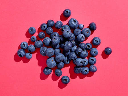 Heap of blueberries on pink background; top view; hard dark shadows