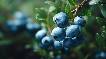 A close-up view of fresh blueberries on a branch, glistening with water droplets. This image captures the vibrant colors and soft bokeh background perfect for nature and food themes.