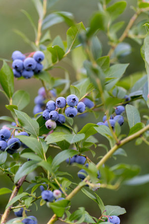Close up of ripe blueberries covered with morning dew hanging on a bush in a blueberry field