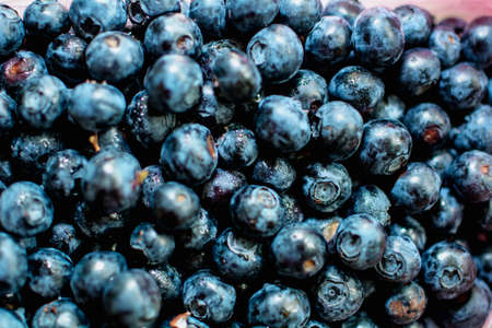 Background with fresh blueberries closeup. Blueberry macro photography. Organic berries of bright blue color. Template for banner, menu, food label, organic shop, garden harvesting. Healthy eating