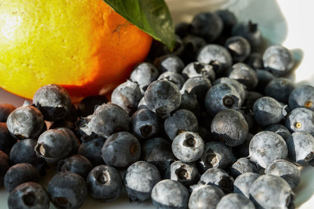 Blueberries and oranges close-up in the sun