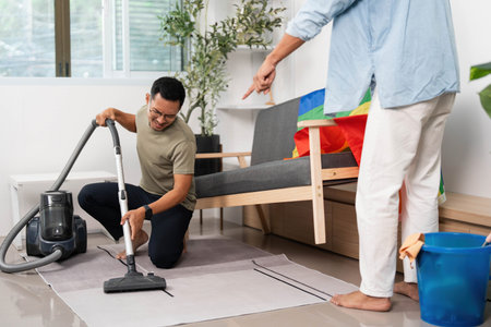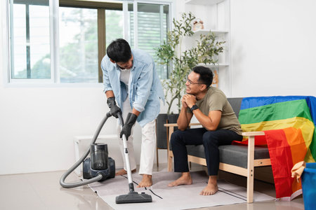 Teamwork in Cleaning. Two friends organizing their living area with a rainbow flag in the background.