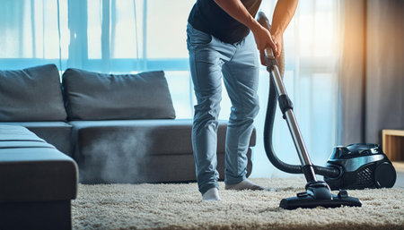 Young man vacuum cleaning carpet in living room