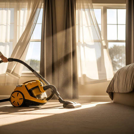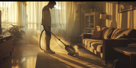 Vacuuming the carpet in a warm and inviting living room filled with soft light