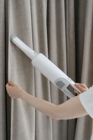 Professional dry cleaning of textiles and fabric with compact household equipment. Vertical view of housekeeper woman vacuuming curtains in room using portable and handheld appliance