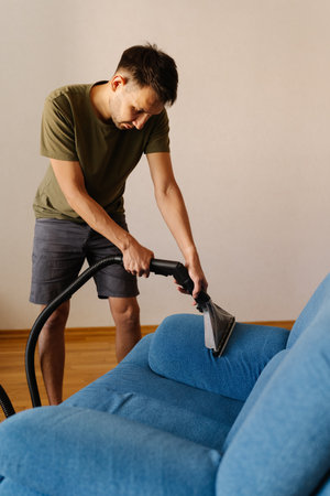 Vertical shot of cleaning worker in causal clothing using washing vacuum cleaner to clean blue sofa in home setting, demonstrating modern approach to household chores and upholstery maintenance.