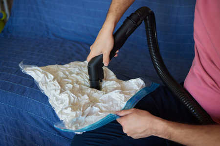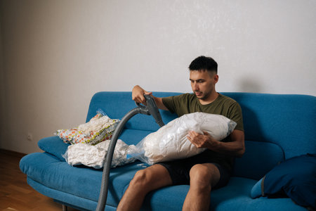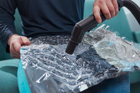 Focused young man sitting on sofa using vacuum cleaner to suck air out of storage bag containing bedding, reducing storage space and protecting from dust and moisture. Concept of household chores.
