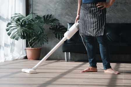 Asian young housekeeper using vacuum machine to clean a dirty floor in the living room close up with copyspace. Housewife vacuuming a floor and sofa in living room.
