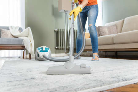 Close-up of young woman cleaning carpet with vacuum cleaner at home