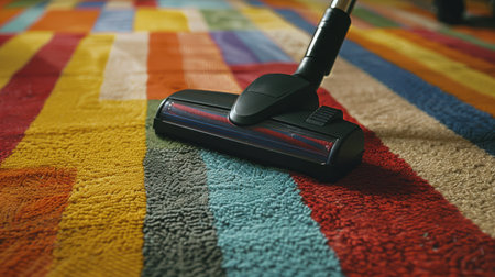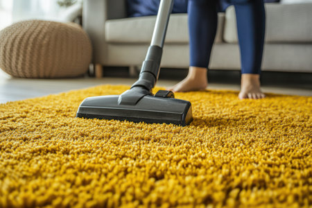 Close-up view of a vacuum cleaner gliding over a bright yellow rug, representing home cleaning, domestic routine, and cleanliness.