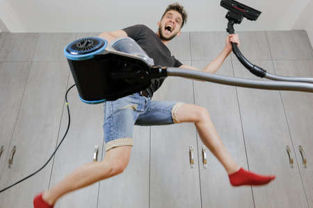 House cleaning. Jumping man with vacuum cleaner. Сleaned apartment