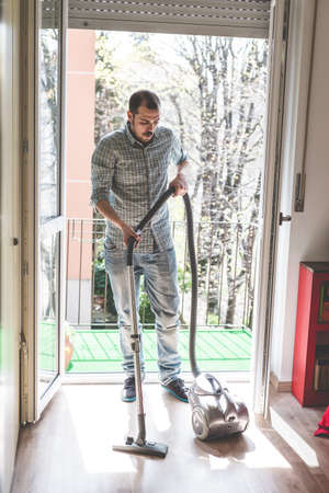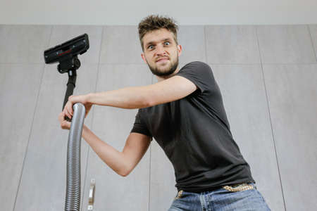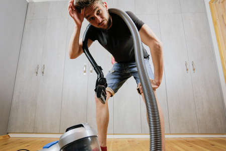 House cleaning. Man with a vacuum cleaner