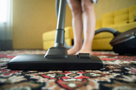 Close up of the vacuum cleaner, focus on the brush, woman cleaning the carpet. Home, housekeeping concept