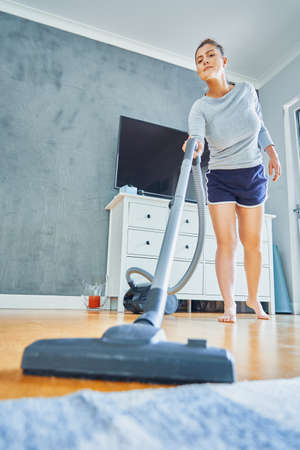 Young housewife cleaning house with vacuum cleaner. Using vacuum cleaner to clean floor in living room
