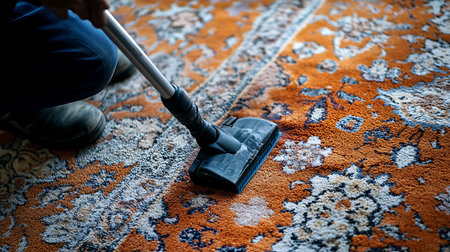 Spring cleaning with vacuum on ornate rug in well-lit interior space