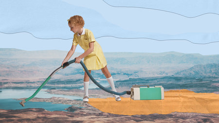 Contemporary art collage. Creative abstract design. Little girl with vacuum cleaner cleaning lake and mountain nature landscape