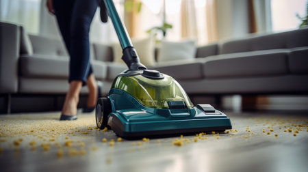 Modern woman cleans flooring with vacuum cleaner in living room generated by artificial intelligence