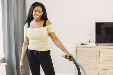 African american woman using vacuum cleaner at home