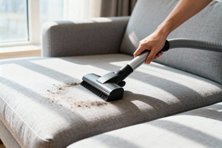 A person vacuums a sofa, removing dust and debris, improving the cleanliness of the living space