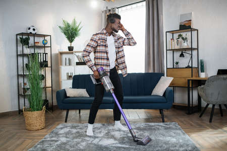 Playful african guy in casual wear removing dust from carpet with handheld vacuum cleaner. Happy man listening music in wireless headphones while doing households.