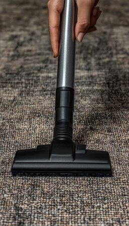 Carpet Cleaning Closeup Adjusting Vacuum Height on Woven Texture for Optimal Home Hygiene