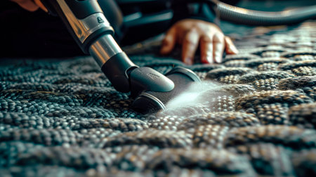 A person expertly manages a vacuum device, swiftly cleaning a plush, patterned carpet that adds warmth and comfort to the cozy home environment.