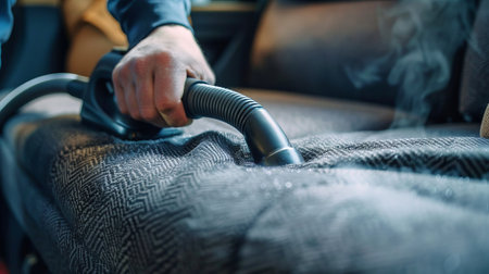 Professional sofa cleaning with a powerful vacuum cleaner. Process of cleaning a detailed couch. Concept of meticulous hygiene, specialized cleaning service, allergen control, and domestic care.