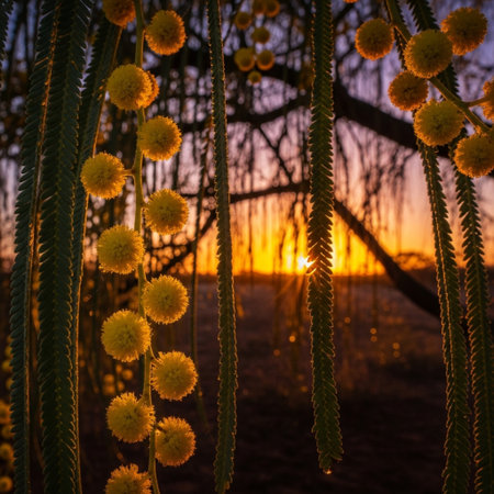 Sunset in the desert with yellow mimosa flowers. Toned.
