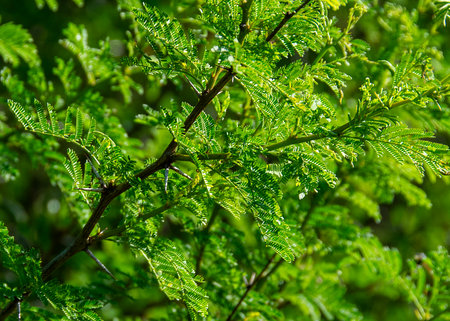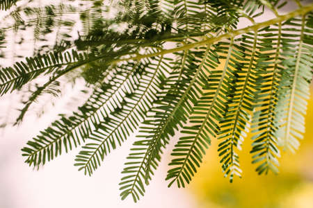 Close up of acacia leaves on a tree in the garden.
