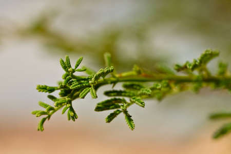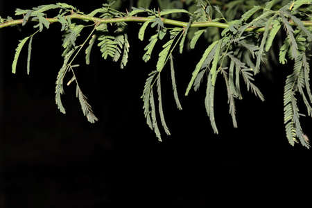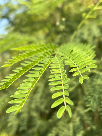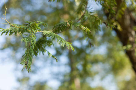 Close up of green leaves of acacia tree on blurred background.