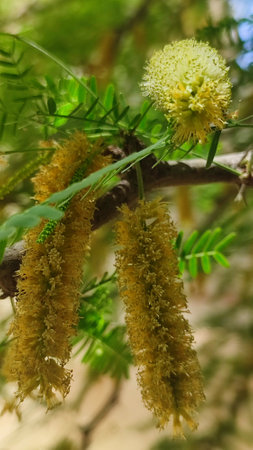 Leaves, flowers, buds and pods of the growing Vachellia farnesiana, known as acacia or sponge acacia grown in an organically