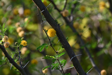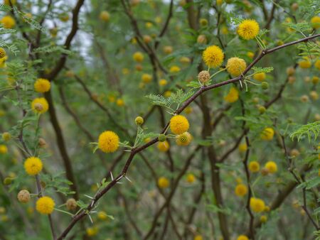 Vachellia nilotica flowers. Its other names gum arabic tree, babul, thorn mimosa, Egyptian acacia and thorny acacia. This is a tree in the family Fabaceae. Yellow Wildflower.