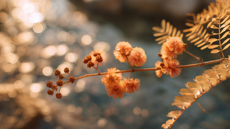 The Water mimosa in fall, warm amber light, crisp air, shallow depth of field, soft natural bokeh, true-to-life color, minimal styling