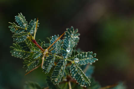 A bunch of green leaves with long thorns and water droplets on them with blur background