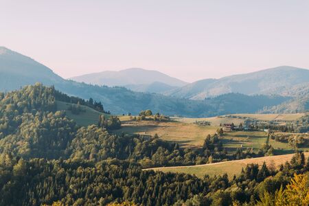 Summer landscape in Romania. Distant mountain range and thin layer of fog on the valleys. Coniferous forest and small houses on hillsides in the Eastern Carpathians.
