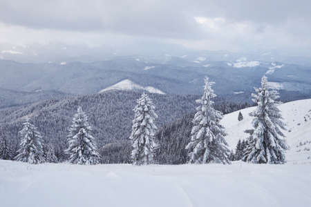Great winter photo in Carpathian mountains with snow covered fir trees. Colorful outdoor scene, Happy New Year celebration concept. Artistic style post processed photo