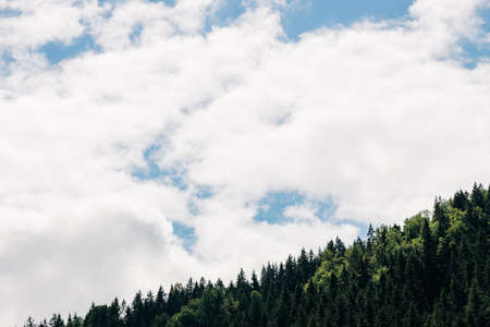 Beautiful mountain scenery with hills at sunny day. Mountain top among clouds in a sky. The tops of tall trees in a pine forest. Green meadows with lush grass. Beautiful nature. Ukrainian Carpathians.