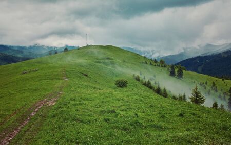 Mountain landscape with fog and clouds, Carpathians, Ukraine