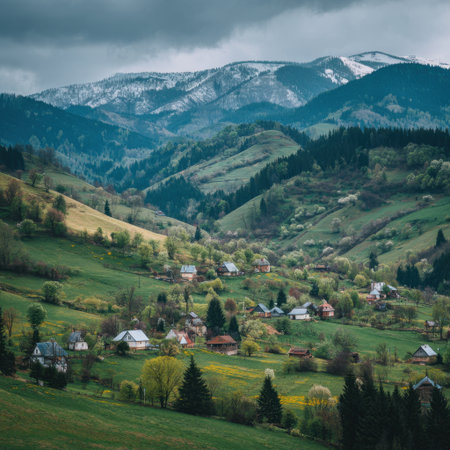 A stunning view of a serene mountain landscape featuring lush green hills and quaint villages, set against a backdrop of snow-capped peaks and a dramatic sky.