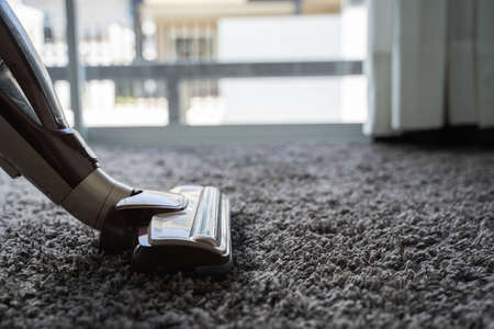 Vacuum cleaner cleaning carpet in living room, close up view.