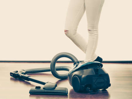 Household cleaning tools and devices, housekeeping duties concept. Woman legs and vacuum cleaner