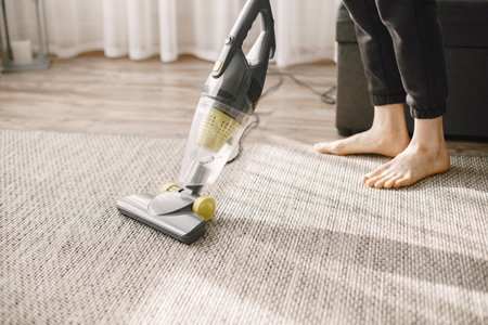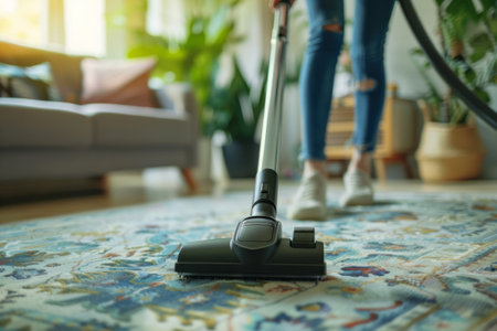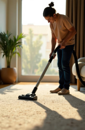 Spring cleaning in a cozy living room highlighting vacuuming on plush carpet