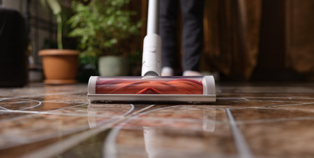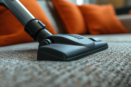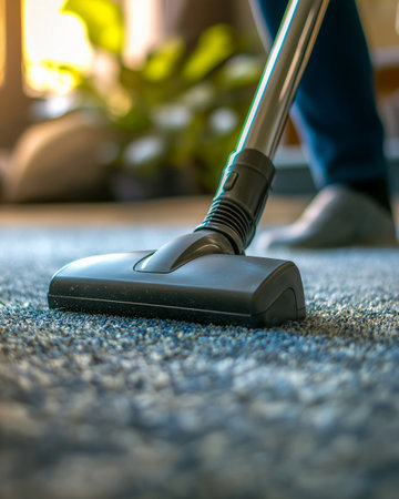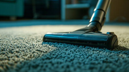 Vacuum cleaner nozzle moving over a light-colored carpet, performing daily cleaning tasks with sunlight illuminating the domestic interior scene, showcasing modern household maintenance