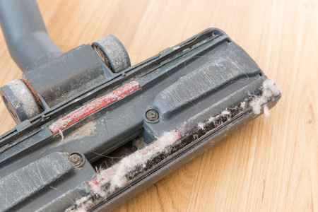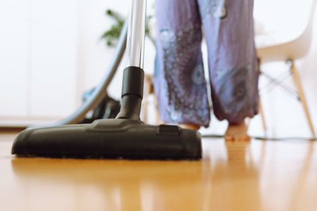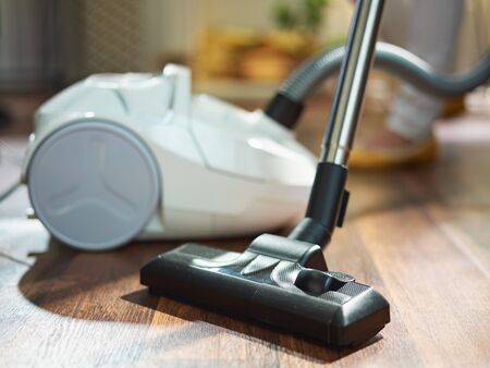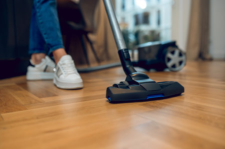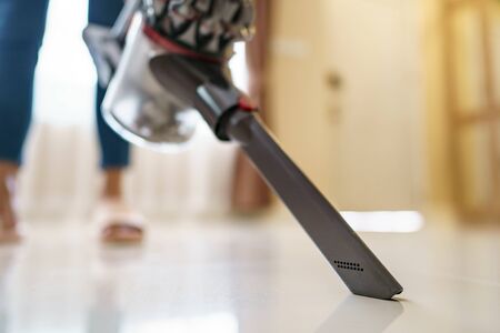 Close-up of housewife using vacuum cleaner and cleaning the floor at home