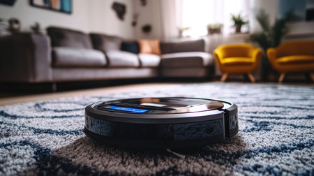 A sleek vacuum cleaner moves across a dark carpet, cleaning efficiently in an elegant living room setting. The lighting adds a cozy ambiance to the scene.