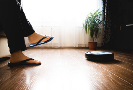 Robot vacuum cleaner on wooden floor. Side view. Smart home concept. Automatic cleaning