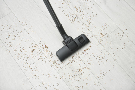 Removing groats from wooden floor with vacuum cleaner at home, top view