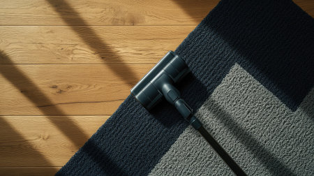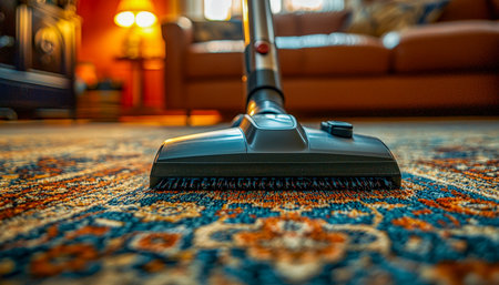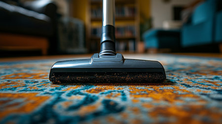 A detailed close-up of a vacuum cleaner head resting on a decorative area rug, showing the importance of cleanliness and hygiene in a warm, inviting living room environment.