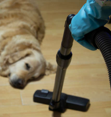 Cleaning the house with a vacuum cleaner, next to the dog breed Labrador Golden Retriever. Cleaning the house where the dog lives. The dog sleeps on the floor and interferes with cleaning.