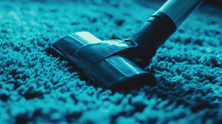 A vacuum cleaner head sits on a soft blue carpet, prepared for cleaning the space effectively. The carpets texture enhances the scene.